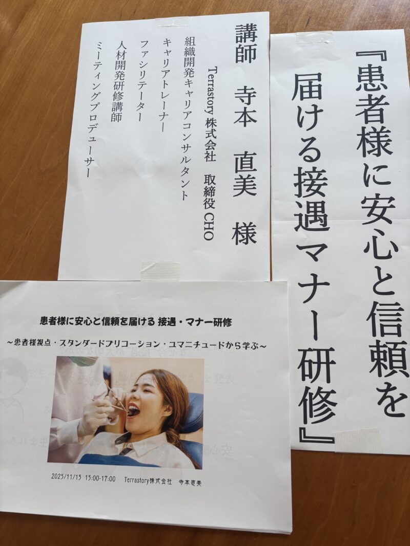 また患者様に何かを行う際に必ず前もって声をかける大切さも印象に残りました。診察や処置の際はもちろん、ちょっとした案内や動作でも説明や一声があるだけで患者様は安心されます。私たちにとっては日常の動作であっても患者様にとっては「何をされるかわからない」不安に繋がることを忘れず今後は意識して丁寧な声がけを徹底していきたいと思います。安心と信頼は日々の積み重ねでしか生まれません。これからの日々の診療にしっかりと活かし、患者様に安心していただける医院作りに努めていきたいと思います。